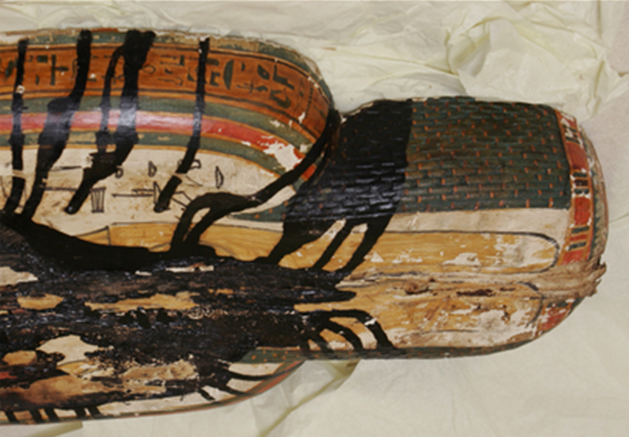 Aujourd'hui, l'avant du cercueil, ainsi que la momie, sont exposés dans les galeries permanentes, tandis que l'arrière est conservé en réserve. Le Dr Serpico a pu étudier les deux pièces, car le matériau noir recouvre également le panneau arrière. D'après les traces de coulures, elle a pu déterminer que la substance sombre avait été nettoyée sur certaines parties de la surface, notamment le visage. Les zones nettoyées sur les épaules et la poitrine ont ensuite été restaurées et repeintes. Il s'agit d'interventions ultérieures qui ont probablement été effectuées après l'exhumation du cercueil, peut-être au XIXe siècle ou au début du XXe siècle, après son arrivée en Alsace. Elle a également remarqué une anomalie structurelle : la planche de bois qui scellait normalement le cercueil sous les pieds avait été remplacée par un morceau de cartonnage provenant probablement d'un masque de momie datant de plusieurs siècles plus tard. Cette modification a très probablement été effectuée avant l'arrivée du cercueil en France, afin de le rendre plus attrayant pour le collectionneur.